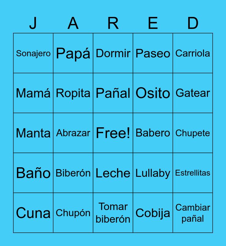 This bingo card has a free space and 24 words: Biberón, Chupón, Pañal, Cuna, Carriola, Sonajero, Mamá, Papá, Babero, Leche, Osito, Manta, Lullaby, Estrellitas, Ropita, Cobija, Chupete, Dormir, Gatear, Abrazar, Cambiar pañal, Baño, Paseo and Tomar biberón.