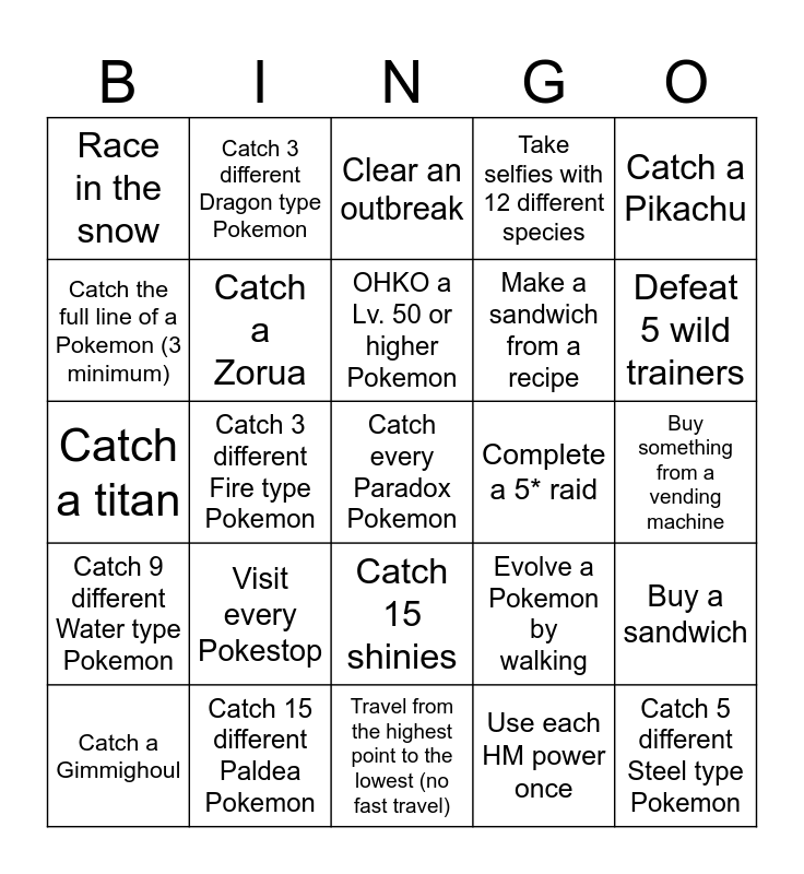This bingo card has 55 words: Evolve a Charcadet, Catch a Gimmighoul, Hatch a Starter, Race in the snow, Travel from the highest point to the lowest (no fast travel), Catch a Ditto, Catch a Zorua, Use a Moon Stone, Make a sandwich from a recipe, Make an original sandwich, Take selfies with 12 different species, Catch every Squawkabilly color, Catch a shiny, Catch a Pokemon in every province, Catch 1 Pokemon from each generation, Evolve a Pokemon using an item, Catch a Pikachu, Catch 3 different Fire type Pokemon, Catch a Frigibax, Catch every Paradox Pokemon, Complete a 5* raid, Complete a 6* raid, Evolve a Pokemon by walking, Clear an outbreak, Go to school (take 3 classes), OHKO a Lv. 50 or higher Pokemon, Use each HM power once, Catch a wild third stage evolution, Buy something from a vending machine, Buy a sandwich, Use a held berry in battle, Complete a 1*, 2*, and 3* raid, Defeat 3 wild Teras, Catch a Spiritomb, Catch the full line of a Pokemon (3 minimum), Catch a titan, Defeat a titan, Catch 9 different Water type Pokemon, Catch 5 different Steel type Pokemon, Catch 5 different Fairy type Pokemon, Catch 3 different Dragon type Pokemon, Catch 5 different Ice type Pokemon, Catch 12 different Normal type Pokemon, Catch 9 different Grass type Pokemon, Visit every Pokestop, Catch 15 different Paldea Pokemon, Catch 8 different Johto Pokemon, Catch 7 different Hoenn Pokemon, Make $100,000, Defeat 5 wild trainers, Evolve a Pokemon with friendship, Change your hair style, Buy and wear a new item of clothing, Catch 15 shinies and Catch all paradox pokemon.