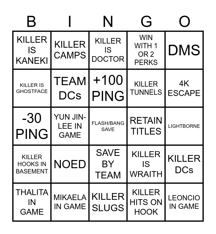 This bingo card has a free space and 24 words: NOED, MIKAELA IN GAME, +100 PING, THALITA IN GAME, DMS, KILLER IS KANEKI, KILLER IS GHOSTFACE, KILLER CAMPS, RETAIN TITLES, SAVE BY TEAM, KILLER TUNNELS, -30 PING, KILLER IS WRAITH, KILLER DCs, TEAM DCs, KILLER HITS ON HOOK, LIGHTBORNE, KILLER IS DOCTOR, 4K ESCAPE, YUN JIN-LEE IN GAME, LEONCIO IN GAME, KILLER HOOKS IN BASEMENT, WIN WITH 1 OR 2 PERKS and KILLER SLUGS.