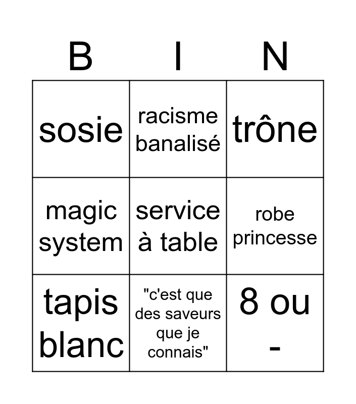 This bingo card has a free space and 8 words: robe princesse, trône, racisme banalisé, tapis blanc, sosie, 8 ou -, magic system and "c'est que des saveurs que je connais".