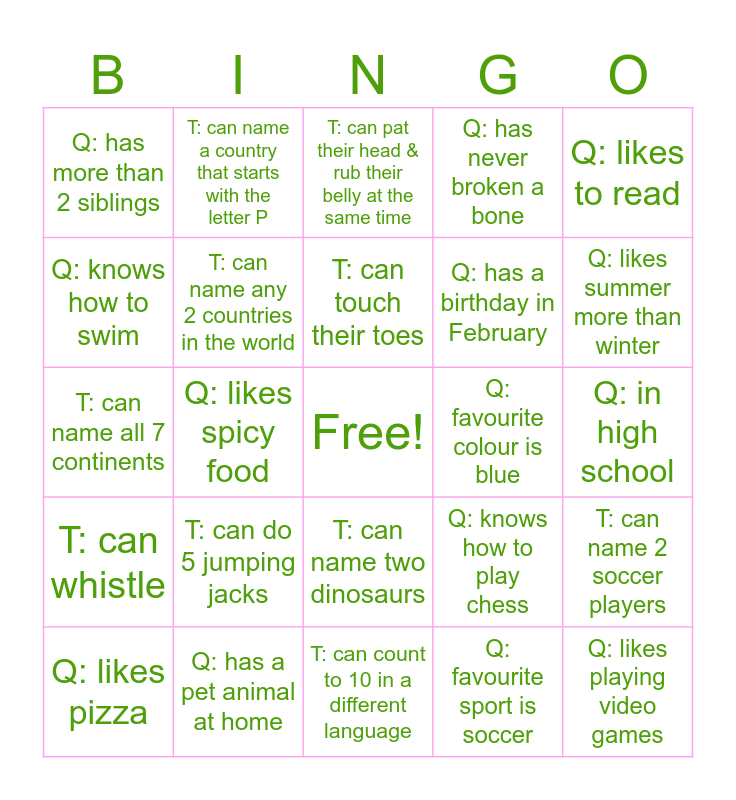 This bingo card has a free space and 24 words: T: can do 5 jumping jacks, Q: has a pet animal at home, T: can touch their toes, Q: likes pizza, Q: likes to read, Q: has more than 2 siblings, Q: knows how to swim, T: can name a country that starts with the letter P, Q: favourite colour is blue, T: can name two dinosaurs, Q: has a birthday in February, T: can name all 7 continents, Q: knows how to play chess, T: can name 2 soccer players, T: can name any 2 countries in the world, Q: favourite sport is soccer, Q: in high school, T: can pat their head & rub their belly at the same time, Q: likes summer more than winter, Q: likes spicy food, Q: likes playing video games, T: can whistle, Q: has never broken a bone and T: can count to 10 in a different language.
