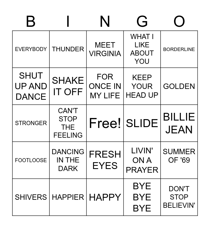 This bingo card has a free space and 24 words: DANCING IN THE DARK, HAPPIER, FOR ONCE IN MY LIFE, SHIVERS, BORDERLINE, EVERYBODY, SHUT UP AND DANCE, THUNDER, SLIDE, FRESH EYES, KEEP YOUR HEAD UP, STRONGER, LIVIN' ON A PRAYER, SUMMER OF '69, SHAKE IT OFF, BYE BYE BYE, BILLIE JEAN, MEET VIRGINIA, GOLDEN, CAN'T STOP THE FEELING, DON'T STOP BELIEVIN', FOOTLOOSE, WHAT I LIKE ABOUT YOU and HAPPY.