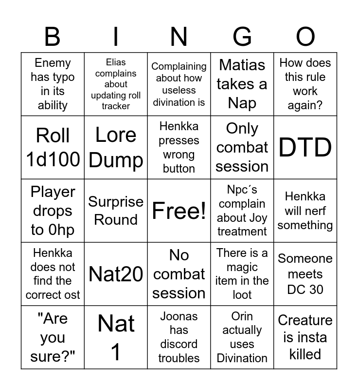 This bingo card has a free space and 24 words: Nat20, Nat 1, Henkka presses wrong button, "Are you sure?", How does this rule work again?, Enemy has typo in its ability, Roll 1d100, Elias complains about updating roll tracker, Npc´s complain about Joy treatment, No combat session, Only combat session, Player drops to 0hp, There is a magic item in the loot, Someone meets DC 30, Lore Dump, Orin actually uses Divination, Henkka will nerf something, Complaining about how useless divination is, DTD, Surprise Round, Creature is insta killed, Henkka does not find the correct ost, Matias takes a Nap and Joonas has discord troubles.