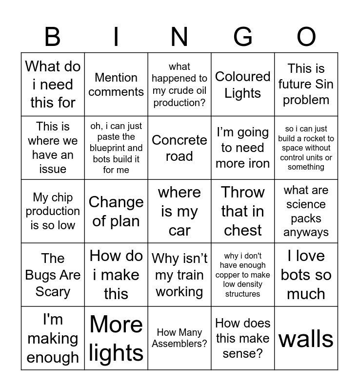 This bingo card has a free space and 24 words: How do i make this, More lights, Concrete road, I'm making enough, This is future Sin problem, What do i need this for, This is where we have an issue, Mention comments, Throw that in chest, Why isn’t my train working, I’m going to need more iron, My chip production is so low, why i don't have enough copper to make low density structures, I love bots so much, oh, i can just paste the blueprint and bots build it for me, How does this make sense?, what are science packs anyways, what happened to my crude oil production?, so i can just build a rocket to space without control units or something, Change of plan, walls, The Bugs Are Scary, Coloured Lights and How Many Assemblers?.