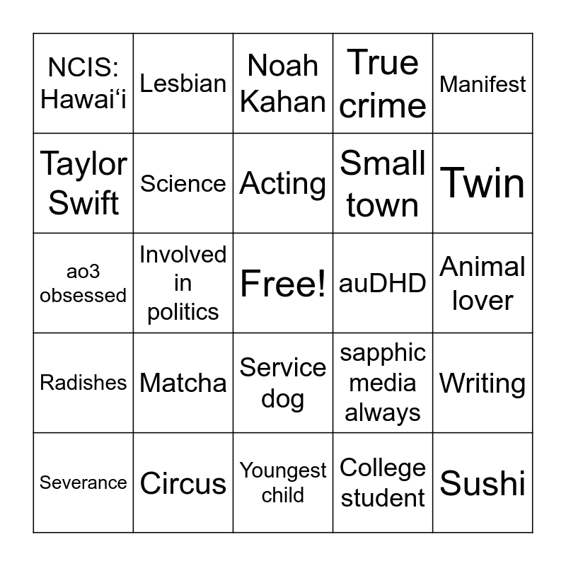 This bingo card has a free space and 24 words: Matcha, Circus, Acting, Severance, Manifest, NCIS: Hawai‘i, Taylor Swift, Lesbian, auDHD, Service dog, Small town, ao3 obsessed, sapphic media always, Writing, Science, College student, Animal lover, Noah Kahan, Twin, Involved in politics, Sushi, Radishes, True crime and Youngest child.