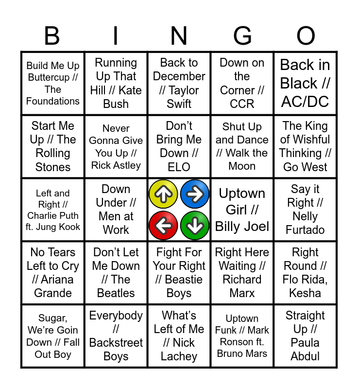 This bingo card has a free space and 31 words: What’s Left of Me // Nick Lachey, Down With the Sickness // Disturbed, Down Under // Men at Work, Up // Cardi B, Build Me Up Buttercup // The Foundations, Back to December // Taylor Swift, Never Gonna Give You Up // Rick Astley, Right Here Waiting // Richard Marx, Uptown Girl // Billy Joel, Uptown Funk // Mark Ronson ft. Bruno Mars, Say it Right // Nelly Furtado, Straight Up // Paula Abdul, Down // Jay Sean, When I’m Gone // Three Doors Down, The King of Wishful Thinking // Go West, Right Back Where We Started From // Maxine Nightingale, Right Round // Flo Rida, Kesha, Don’t Let Me Down // The Beatles, No Tears Left to Cry // Ariana Grande, Fight For Your Right // Beastie Boys, Back in Black // AC/DC, I’m Too Sexy // Right Said Fred, Sugar, We’re Goin Down // Fall Out Boy, Running Up That Hill // Kate Bush, Shut Up and Dance // Walk the Moon, Start Me Up // The Rolling Stones, Down on the Corner // CCR, Left and Right // Charlie Puth ft. Jung Kook, Everybody // Backstreet Boys, Don’t Bring Me Down // ELO and Clint Eastwood // Gorillaz.