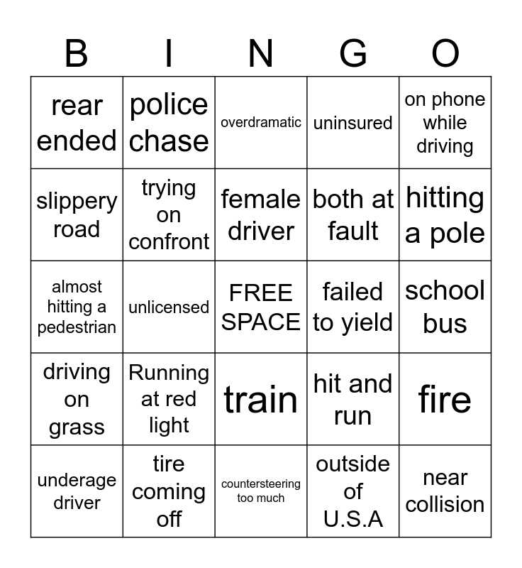 This bingo card has a free space and 24 words: Running at red light, tire coming off, female driver, underage driver, on phone while driving, rear ended, slippery road, police chase, failed to yield, train, both at fault, almost hitting a pedestrian, hit and run, fire, trying on confront, outside of U.S.A, school bus, overdramatic, hitting a pole, unlicensed, near collision, driving on grass, uninsured and countersteering too much.