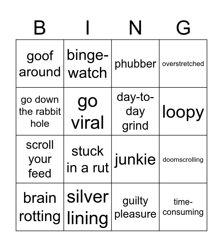 This bingo card has 16 words: silver lining, doomscrolling, phubber, goof around, scroll your feed, binge-watch, junkie, guilty pleasure, go down the rabbit hole, go viral, brain rotting, overstretched, stuck in a rut, loopy, day-to-day grind and time-consuming.