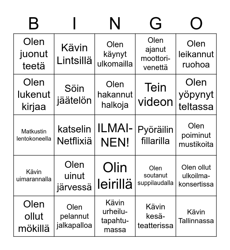 This bingo card has a free space and 24 words: Olen uinut järvessä, Olen pelannut jalkapalloa, Olen hakannut halkoja, Olen ollut mökillä, Olen leikannut ruohoa, Olen juonut teetä, Olen lukenut kirjaa, Kävin Lintsillä, Pyöräilin fillarilla, Olin leirillä, Tein videon, Matkustin lentokoneella, Olen soutanut suppilaudalla, Olen ollut ulkoilma-konsertissa, Söin jäätelön, Kävin kesä-teatterissa, Olen poiminut mustikoita, Olen käynyt ulkomailla, Olen yöpynyt teltassa, katselin Netflixiä, Kävin Tallinnassa, Kävin uimarannalla, Olen ajanut moottori-venettä and Kävin urheilu-tapahtu-massa.