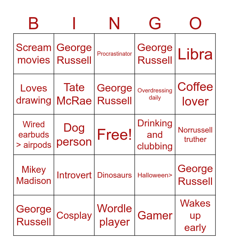 This bingo card has a free space and 29 words: George Russell, Dyed hair, Dog person, Sweet > savoury, Scream movies, Procrastinator, Tate McRae, Introvert, Drinking and clubbing, Cosplay, Norrussell truther, Wakes up early, Wordle player, Gamer, Coffee lover, Ipad kid, Dinosaurs, Mikey Madison, Libra, Wired earbuds > airpods, Halloween>, Fav colour is red, Overdressing daily, Loves drawing, George Russell, George Russell, George Russell, George Russell and George Russell.