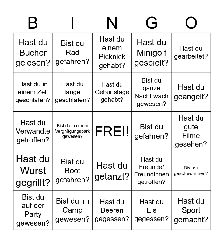 This bingo card has a free space and 24 words: Bist du Boot gefahren?, Bist du im Camp gewesen?, Hast du Geburtstage gehabt?, Bist du auf der Party gewesen?, Hast du gearbeitet?, Hast du Bücher gelesen?, Hast du in einem Zelt geschlafen?, Bist du Rad gefahren?, Bist du gefahren?, Hast du getanzt?, Bist du ganze Nacht wach gewesen?, Hast du Verwandte getroffen?, Hast du Freunde/ Freundinnen getroffen?, Bist du geschwommen?, Hast du lange geschlafen?, Hast du Eis gegessen?, Hast du gute Filme gesehen?, Hast du einem Picknick gehabt?, Hast du geangelt?, Bist du in einem Vergnügungspark gewesen?, Hast du Sport gemacht?, Hast du Wurst gegrillt?, Hast du Minigolf gespielt? and Hast du Beeren gegessen?.