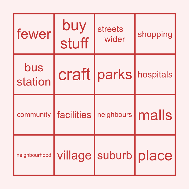 This bingo card has 17 words: suburb, neighbourhood, streets wider, fewer, facilities, shopping, malls, parks, hospitals, craft, village, neighbours, bus station, buy stuff, community, advice and place.