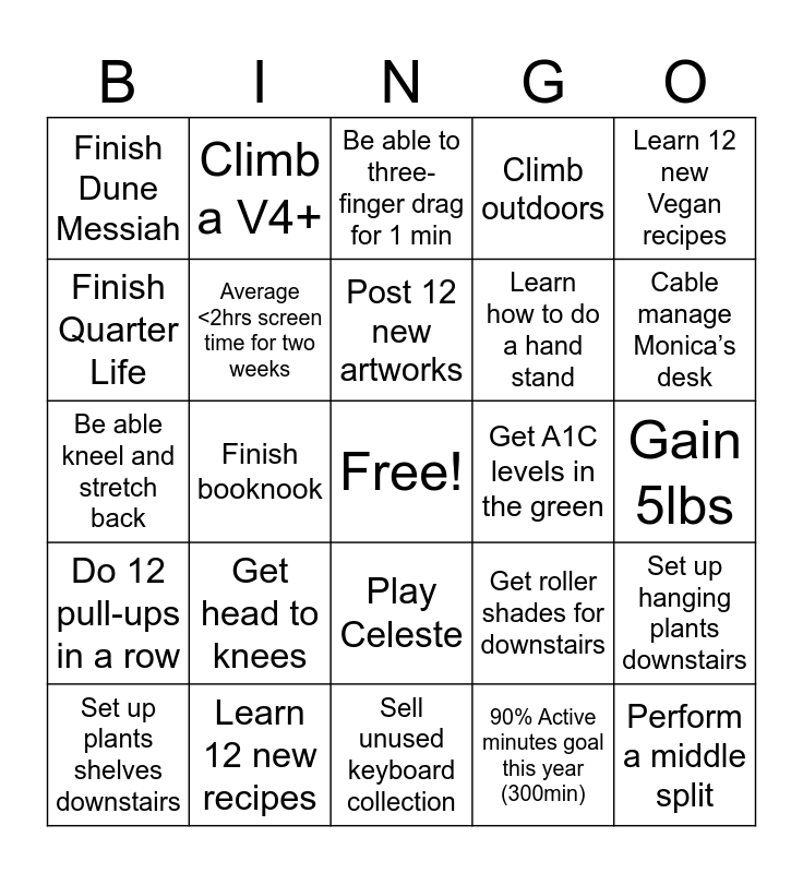 This bingo card has a free space and 26 words: Play Celeste, 90% Active minutes goal this year (300min), Post 12 new artworks, Learn 12 new recipes, Learn 12 new Vegan recipes, Finish Dune Messiah, Finish Quarter Life, Climb a V4+, Gain 5lbs, Get roller shades for downstairs, Learn how to do a hand stand, Be able kneel and stretch back, Set up hanging plants downstairs, Set up plants shelves downstairs, Finish booknook, Set up a garden bed, Climb outdoors, Do 12 pull-ups in a row, Be able to three-finger drag for 1 min, Perform a middle split, Cable manage Monica’s desk, Sell unused keyboard collection, Get A1C levels in the green, Get head to knees, Average <2hrs screen time for two weeks and Try journaling for a month.