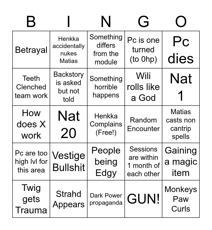 This bingo card has a free space and 24 words: Vestige Bullshit, Strahd Appears, Something horrible happens, Twig gets Trauma, Pc dies, Betrayal, Teeth Clenched team work, Henkka accidentally nukes Matias, Random Encounter, People being Edgy, Wili rolls like a God, How does X work, Sessions are within 1 month of each other, Gaining a magic item, Backstory is asked but not told, GUN!, Matias casts non cantrip spells, Something differs from the module, Nat 1, Nat 20, Monkeys Paw Curls, Pc are too high lvl for this area, Pc is one turned (to 0hp) and Dark Power propaganda.