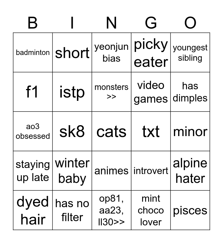 This bingo card has 25 words: winter baby, op81, aa23, ll30>>, monsters >>, dyed hair, youngest sibling, badminton, f1, short, txt, animes, video games, ao3 obsessed, introvert, alpine hater, istp, pisces, minor, yeonjun bias, has dimples, sk8, cats, has no filter, staying up late, picky eater and mint choco lover.