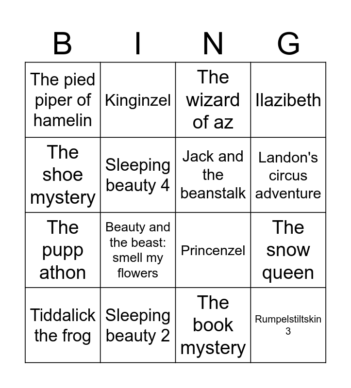 This bingo card has 70 words: Free!, The book mystery, Italian brainrot: zebra zubra's of the story, Aladdin, Little red riding hood, The book mystery: amazing bookshelf, Ilazibeth, Around the world adventure, The shoe mystery, The banana mystery, Rumpelstiltskin: spin the wheel, The three little pigs, The pied piper of hamelin, The wizard of az, Where's woofster, The snow queen, Super puppy saves the day, The pupp athon, Webby in bathland, Rumpelstiltskin 3, Sleeping beauty 2, Heidi, Beauty and the beast: smell my flowers, Naila and the magic map, The great magic map, Attack of the eraser, The feather mystery, The boy who lost cinderella, The missing princess of pet city, Hansel and gretel, Kinginzel, King midas, Goldilocks and the three bears, Woofster finds a home, The fox and the stork, Huckleberry finn, A day with farmer fred, The little mermaid, The tortoise and the hare, Sleeping beauty 4, Goldilocks and the three bears: the mystery, Hansel and gretel: a healthy adventure, Tiddalick the frog, The three billy goats gruff, The key mystery, Jack and the beanstalk, The princess and the pea, Peter rabbit, The princess who drew shoes, The princess who loved mud, The twelve dancing princesses, The red shoes, George and the dragon, Muddled up fairytales, The troll and the seven little pigs, The unhappy puppy, Landon's circus adventure, The sheep who lost little bo peep, Little miss muffet, Dr. dolittle, Princenzel, The story of the super readers, The story of the tooth fairy, Molly's dance show, Mathis book of why, The swiss family robinson, Pinocchio, Cindenzel, Jasper's cowboy wish and Alice in wonderland.