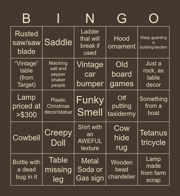 This bingo card has a free space and 24 words: Creepy Doll, Table missing leg, Vintage car bumper, Bottle with a dead bug in it, Wasp guarding a building/section, Rusted saw/saw blade, “Vintage” table (from Target), Saddle, Off putting taxidermy, Shirt with an AWEFUL texture, Old board games, Lamp priced at >$300, Cow hide rug, Tetanus tricycle, Matching salt and pepper shaker people, Wooden bead chandelier, Something from a boat, Ladder that will break if used, Just a rock, as table decor, Plastic Christmas decor/statue, Lamp made from farm scrap, Cowbell, Hood ornament and Metal Soda or Gas sign.