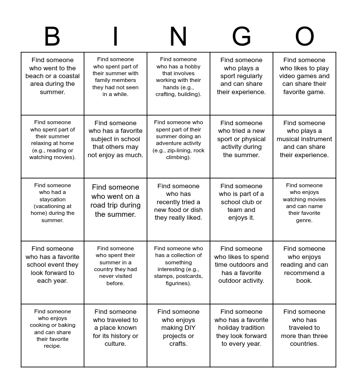 This bingo card has a free space and 24 words: Find someone who spent their summer in a country they had never visited before., Find someone who traveled to a place known for its history or culture., Find someone who spent part of their summer doing an adventure activity (e.g., zip-lining, rock climbing)., Find someone who enjoys cooking or baking and can share their favorite recipe., Find someone who likes to play video games and can share their favorite game., Find someone who went to the beach or a coastal area during the summer., Find someone who spent part of their summer relaxing at home (e.g., reading or watching movies)., Find someone who spent part of their summer with family members they had not seen in a while., Find someone who is part of a school club or team and enjoys it., Find someone who has a collection of something interesting (e.g., stamps, postcards, figurines)., Find someone who tried a new sport or physical activity during the summer., Find someone who had a staycation (vacationing at home) during the summer., Find someone who likes to spend time outdoors and has a favorite outdoor activity., Find someone who enjoys reading and can recommend a book., Find someone who has a favorite subject in school that others may not enjoy as much., Find someone who has a favorite holiday tradition they look forward to every year., Find someone who enjoys watching movies and can name their favorite genre., Find someone who has a hobby that involves working with their hands (e.g., crafting, building)., Find someone who plays a musical instrument and can share their experience., Find someone who went on a road trip during the summer., Find someone who has traveled to more than three countries., Find someone who has a favorite school event they look forward to each year., Find someone who plays a sport regularly and can share their experience. and Find someone who enjoys making DIY projects or crafts..