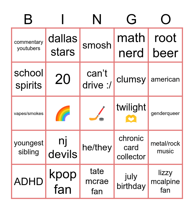 This bingo card has a free space and 24 words: nj devils, kpop fan, can’t drive :/, ADHD, root beer, commentary youtubers, school spirits, dallas stars, twilight 🫶, he/they, clumsy, vapes/smokes, chronic card collector, metal/rock music, 20, july birthday, genderqueer, smosh, american, 🌈, lizzy mcalpine fan, youngest sibling, math nerd and tate mcrae fan.