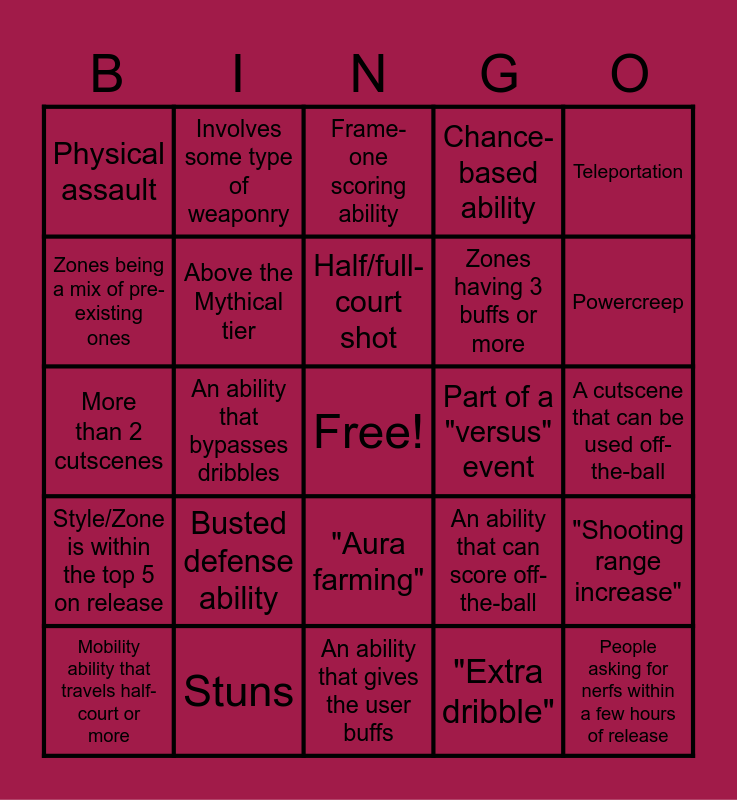 This bingo card has a free space and 24 words: Busted defense ability, Stuns, Half/full-court shot, Mobility ability that travels half-court or more, Teleportation, Physical assault, Zones being a mix of pre-existing ones, Involves some type of weaponry, Part of a "versus" event, "Aura farming", Zones having 3 buffs or more, More than 2 cutscenes, An ability that can score off-the-ball, "Shooting range increase", Above the Mythical tier, "Extra dribble", A cutscene that can be used off-the-ball, Frame-one scoring ability, Powercreep, An ability that bypasses dribbles, People asking for nerfs within a few hours of release, Style/Zone is within the top 5 on release, Chance-based ability and An ability that gives the user buffs.