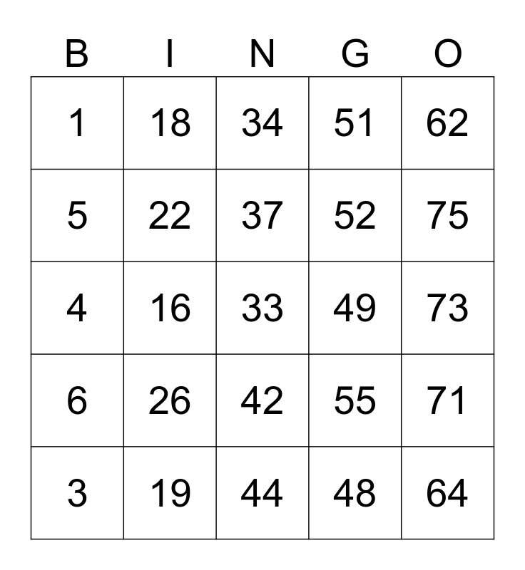 This bingo card has 25 words: 6, 19, 33, 48, 62, 1, 18, 34, 49, 71, 5, 22, 44, 55, 75, 3, 16, 37, 52, 73, 4, 26, 42, 51 and 64.
