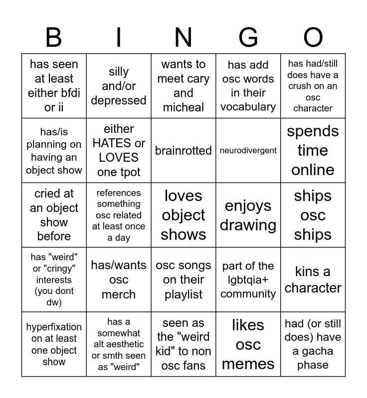 This bingo card has a free space and 24 words: has/wants osc merch, has a somewhat alt aesthetic or smth seen as "weird", brainrotted, hyperfixation on at least one object show, has had/still does have a crush on an osc character, has seen at least either bfdi or ii, has/is planning on having an object show, silly and/or depressed, enjoys drawing, osc songs on their playlist, neurodivergent, cried at an object show before, part of the lgbtqia+ community, kins a character, either HATES or LOVES one tpot, likes osc memes, ships osc ships, wants to meet cary and micheal, spends time online, references something osc related at least once a day, had (or still does) have a gacha phase, has "weird" or "cringy" interests (you dont dw), has add osc words in their vocabulary and seen as the "weird kid" to non osc fans.