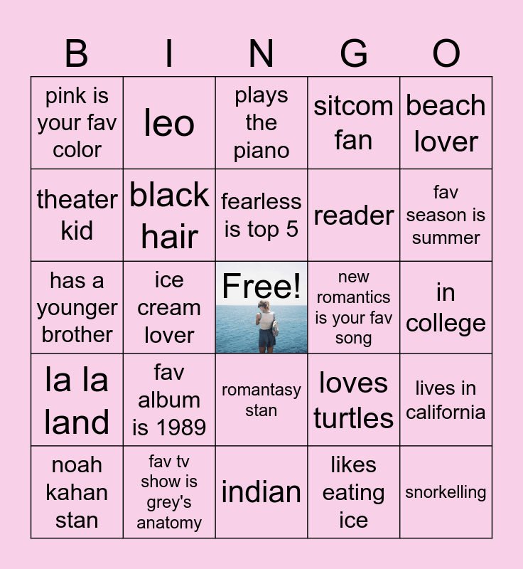 This bingo card has a free space and 24 words: fav album is 1989, fav tv show is grey's anatomy, fearless is top 5, noah kahan stan, beach lover, pink is your fav color, theater kid, leo, new romantics is your fav song, romantasy stan, reader, has a younger brother, loves turtles, lives in california, black hair, likes eating ice, in college, plays the piano, fav season is summer, ice cream lover, snorkelling, la la land, sitcom fan and indian.