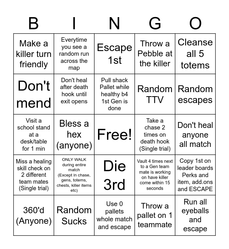 This bingo card has a free space and 24 words: ONLY WALK during entire match (Except in chase, gens, totems, chests, killer items etc), Random Sucks, Pull shack Pallet while healthy b4 1st Gen is done, 360'd (Anyone), Cleanse all 5 totems, Make a killer turn friendly, Don't mend, Everytime you see a random run across the map, Take a chase 2 times on death hook (Single trial), Die 3rd, Random TTV, Visit a school stand at a desk/table for 1 min, Vault 4 times next to a Gen team mate is working on have killer come within 15 seconds, Copy 1st on leader boards Perks and item, add.ons and ESCAPE, Don't heal after death hook until exit opens, Throw a pallet on 1 teammate, Don't heal anyone all match, Escape 1st, Random escapes, Bless a hex (anyone), Run all eyeballs and escape, Miss a healing skill check on 2 different team mates (Single trial), Throw a Pebble at the killer and Use 0 pallets whole match and escape.