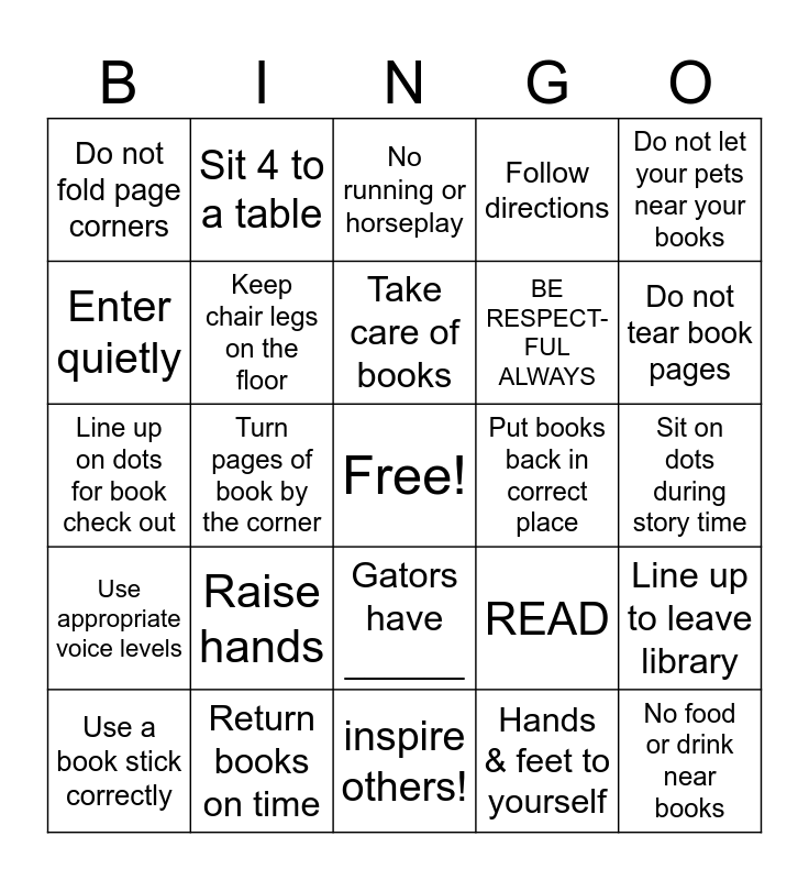 This bingo card has a free space and 24 words: Raise hands, Return books on time, Take care of books, Use a book stick correctly, Do not let your pets near your books, Do not fold page corners, Enter quietly, Sit 4 to a table, Put books back in correct place, Gators have ______, BE RESPECT- FUL ALWAYS, Line up on dots for book check out, READ, Line up to leave library, Keep chair legs on the floor, Hands & feet to yourself, Sit on dots during story time, No running or horseplay, Do not tear book pages, Turn pages of book by the corner, No food or drink near books, Use appropriate voice levels, Follow directions and inspire others!.