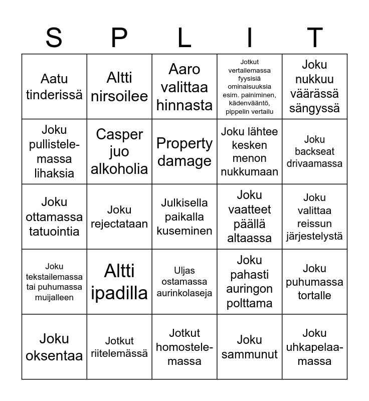 This bingo card has a free space and 24 words: Joku oksentaa, Altti ipadilla, Property damage, Joku sammunut, Joku nukkuu väärässä sängyssä, Aatu tinderissä, Altti nirsoilee, Aaro valittaa hinnasta, Joku vaatteet päällä altaassa, Joku valittaa reissun järjestelystä, Joku ottamassa tatuointia, Casper juo alkoholia, Joku pahasti auringon polttama, Joku puhumassa tortalle, Joku pullistele-massa lihaksia, Jotkut riitelemässä, Jotkut homostele-massa, Jotkut vertailemassa fyysisiä ominaisuuksia esim. painiminen, kädenvääntö, pippelin vertailu, Joku backseat drivaamassa, Joku tekstailemassa tai puhumassa muijalleen, Joku rejectataan, Uljas ostamassa aurinkolaseja, Joku lähtee kesken menon nukkumaan and Joku uhkapelaa-massa.