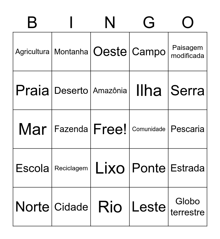 This bingo card has a free space and 45 words: Mapa, Globo terrestre, Rosa dos ventos, Norte, Sul, Leste, Oeste, Paisagem natural, Paisagem modificada, Cidade, Campo, Comunidade, Lixo, Reciclagem, Água, Rio, Lago, Mar, Oceano, Serra, Montanha, Planície, Solo, Agricultura, Pecuária, Pescaria, Mineração, Construção, Ponte, Escola, Praça, Estrada, Casa, Hospital, Comércio, Fazenda, Floresta, Cerrado, Caatinga, Amazônia, Praia, Ilha, Península, Deserto and Neve.