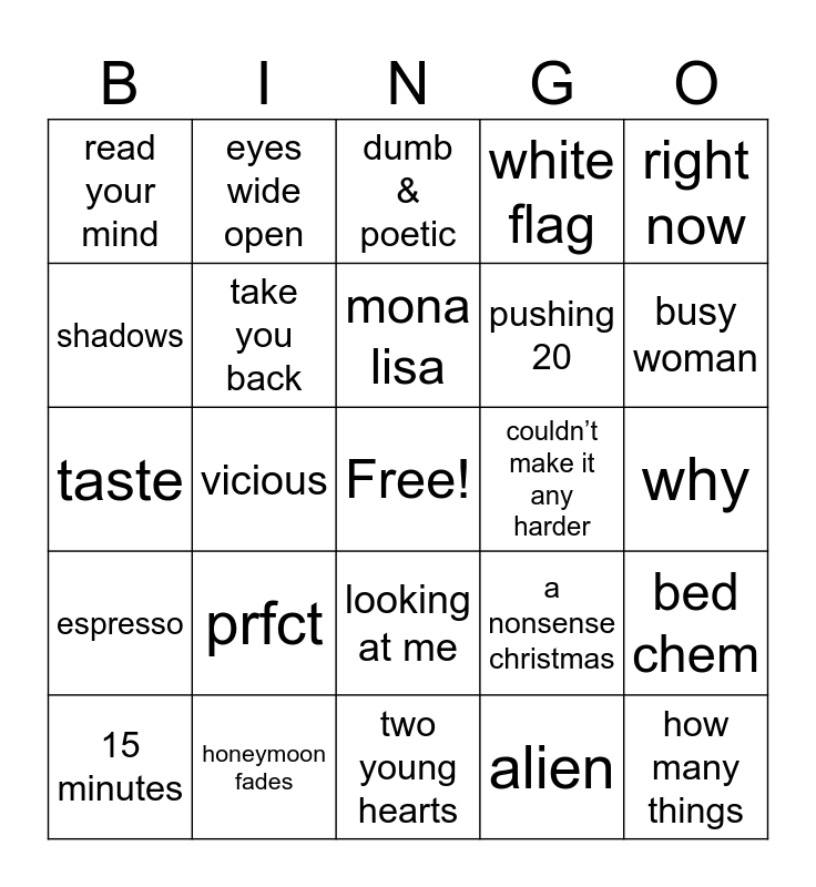 This bingo card has a free space and 64 words: manchild, mirage, almost love, bed chem, coincidence, emails i can’t send, eyes wide open, on purpose, mona lisa, bet u wanna, looking at me, paris, why, right now, sharpest tool, shadows, vicious, read your mind, skin, pushing 20, prfct, espresso, white flag, cindy lou who, already over, don’t want it back, bad time, can’t blame a girl for trying, because i liked a boy, thumbs, well he the stars, smoke and fire, sue me, please please please, busy woman, 15 minutes, too young, alien, diamonds are forever, take you back, taste, couldn’t make it any harder, tell em, hold tight, exhale, how many things, honeymoon fades, nonsense, a nonsense christmas, decode, opposite, lie to girls, two young hearts, juno, lonesome, tornado warnings, dumb & poetic, good graces, bad reviews, things i wish you said, already over, skinny dipping, i’m fakin and run and hide.