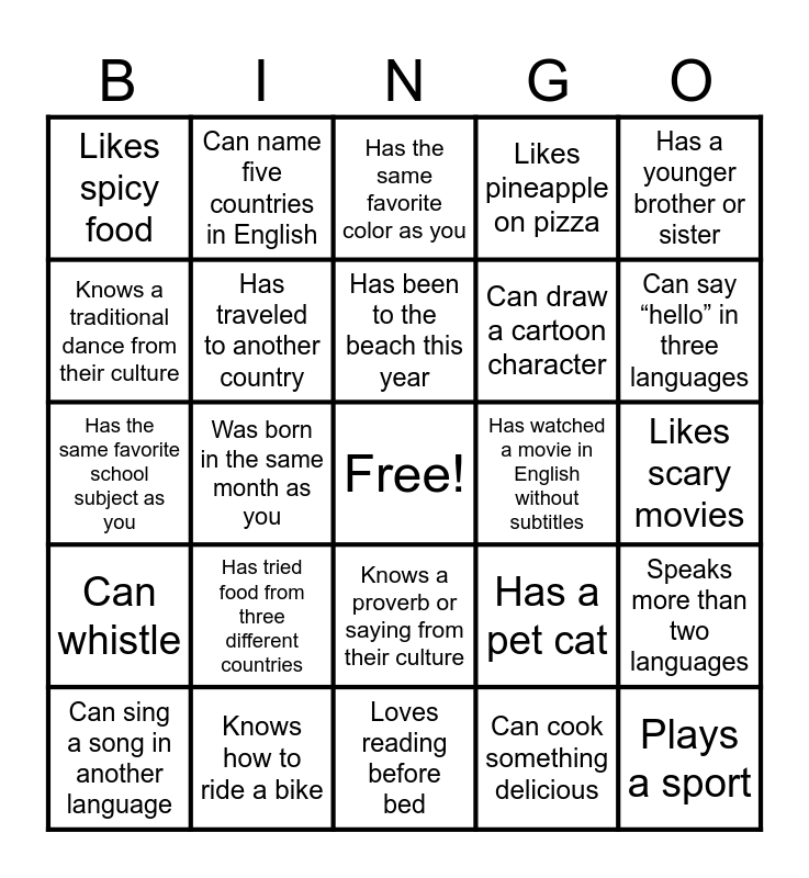 This bingo card has a free space and 24 words: Has tried food from three different countries, Knows how to ride a bike, Has been to the beach this year, Can sing a song in another language, Has a younger brother or sister, Likes spicy food, Knows a traditional dance from their culture, Can name five countries in English, Has watched a movie in English without subtitles, Knows a proverb or saying from their culture, Can draw a cartoon character, Has the same favorite school subject as you, Has a pet cat, Speaks more than two languages, Has traveled to another country, Can cook something delicious, Likes scary movies, Has the same favorite color as you, Can say “hello” in three languages, Was born in the same month as you, Plays a sport, Can whistle, Likes pineapple on pizza and Loves reading before bed.