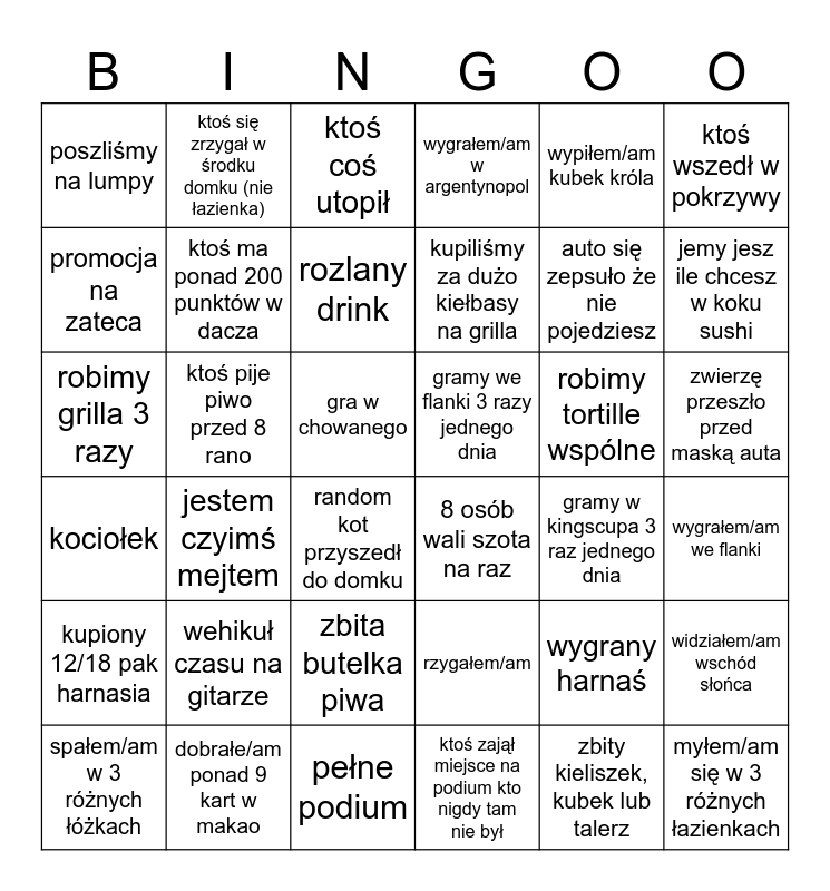 This bingo card has 36 words: rzygałem/am, zbita butelka piwa, ktoś zajął miejsce na podium kto nigdy tam nie był, promocja na zateca, kociołek, gramy we flanki 3 razy jednego dnia, ktoś ma ponad 200 punktów w dacza, pełne podium, wypiłem/am kubek króla, wygrany harnaś, jemy jesz ile chcesz w koku sushi, wygrałem/am w argentynopol, widziałem/am wschód słońca, ktoś pije piwo przed 8 rano, kupiliśmy za dużo kiełbasy na grilla, poszliśmy na lumpy, kupiony 12/18 pak harnasia, robimy tortille wspólne, robimy grilla 3 razy, ktoś coś utopił, gra w chowanego, jestem czyimś mejtem, 8 osób wali szota na raz, random kot przyszedł do domku, gramy w kingscupa 3 raz jednego dnia, ktoś się zrzygał w środku domku (nie łazienka), auto się zepsuło że nie pojedziesz, dobrałe/am ponad 9 kart w makao, rozlany drink, ktoś wszedł w pokrzywy, myłem/am się w 3 różnych łazienkach, spałem/am w 3 różnych łóżkach, wygrałem/am we flanki, zwierzę przeszło przed maską auta, wehikuł czasu na gitarze and zbity kieliszek, kubek lub talerz.
