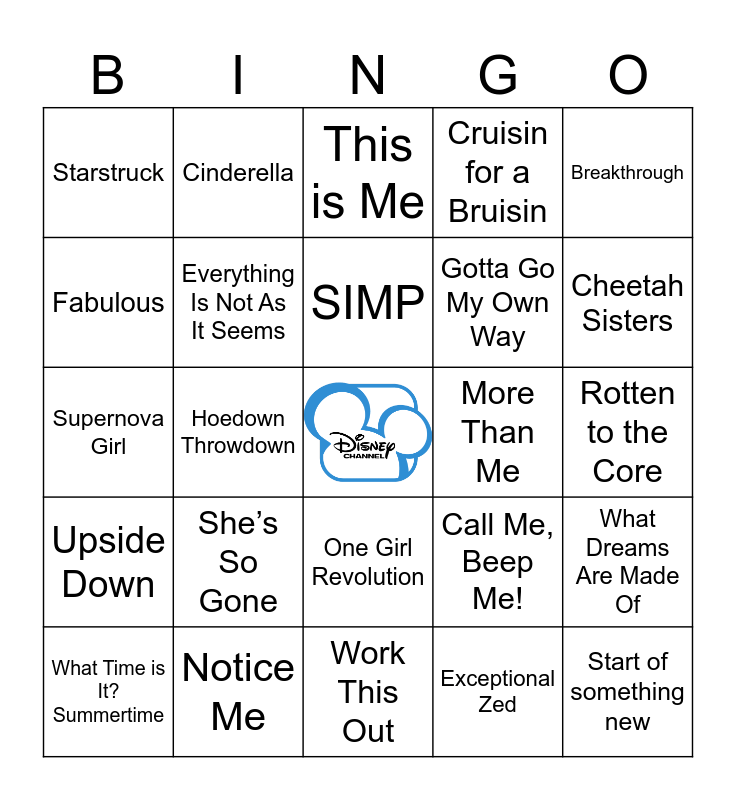 This bingo card has a free space and 43 words: Getcha head in the game, Start of something new, All in this together, What Time is It? Summertime, One Day, Exceptional Zed, This is Me, Can’t Back Down, Breakthrough, Notice Me, Cruisin for a Bruisin, More Than Me, One Girl Revolution, She’s So Gone, Wouldn’t Change a Thing, Work This Out, Push It to the Limit, Supernova Girl, Strut, Cheetah Sisters, Cinderella, One and the Same, Dance Me If You Can, Starstruck, Hero, Rotten to the Core, The Climb, The Best of Both Worlds, Call Me, Beep Me!, Upside Down, Evil Like Me, What Dreams Are Made Of, On My Own, Hoedown Throwdown, So Far So Great, Ordinary Girl, Jump to the Rhythm, SIMP, Fabulous, Gotta Go My Own Way, Come On Out, Everything Is Not As It Seems and We Own the Night.