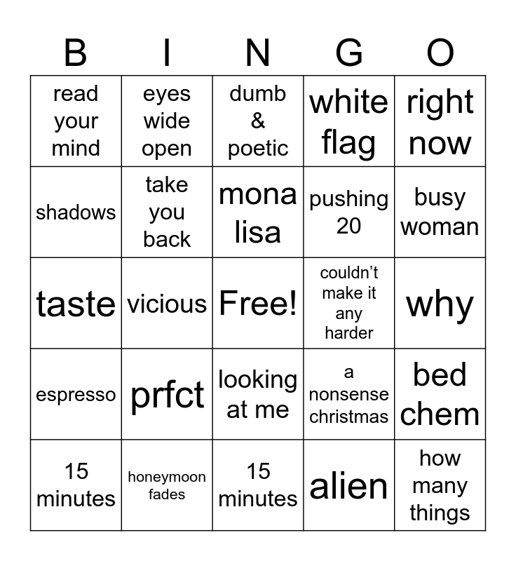 This bingo card has a free space and 64 words: manchild, mirage, almost love, bed chem, coincidence, emails i can’t send, eyes wide open, on purpose, mona lisa, bet u wanna, looking at me, paris, why, right now, sharpest tool, shadows, vicious, read your mind, skin, pushing 20, prfct, espresso, white flag, cindy lou who, already over, don’t want it back, bad time, can’t blame a girl for trying, because i liked a boy, thumbs, well he the stars, smoke and fire, sue me, please please please, busy woman, 15 minutes, too young, alien, diamonds are forever, take you back, taste, couldn’t make it any harder, tell em, hold tight, exhale, how many things, honeymoon fades, nonsense, a nonsense christmas, decode, opposite, lie to girls, 15 minutes, juno, lonesome, tornado warnings, dumb & poetic, good graces, bad reviews, things i wish you said, already over, skinny dipping, take you back and run and hide.