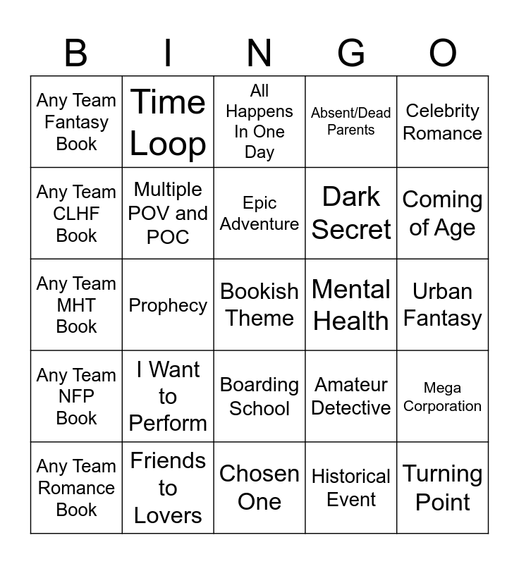 This bingo card has a free space and 24 words: Any Team Romance Book, I Want to Perform, Epic Adventure, Historical Event, Celebrity Romance, Any Team Fantasy Book, Time Loop, All Happens In One Day, Mental Health, Urban Fantasy, Any Team MHT Book, Multiple POV and POC, Amateur Detective, Mega Corporation, Any Team CLHF Book, Friends to Lovers, Chosen One, Absent/Dead Parents, Coming of Age, Any Team NFP Book, Prophecy, Boarding School, Dark Secret and Turning Point.