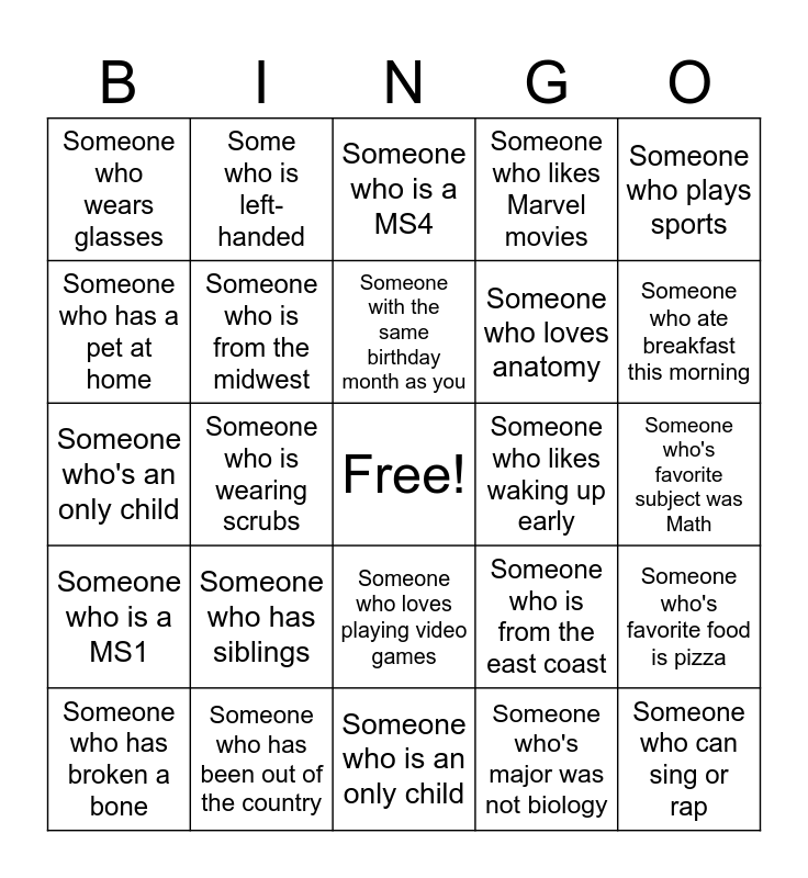 This bingo card has a free space and 24 words: Someone who has siblings, Someone who has been out of the country, Someone with the same birthday month as you, Someone who has broken a bone, Someone who plays sports, Someone who wears glasses, Someone who has a pet at home, Some who is left-handed, Someone who likes waking up early, Someone who loves playing video games, Someone who loves anatomy, Someone who's an only child, Someone who is from the east coast, Someone who's favorite food is pizza, Someone who is from the midwest, Someone who's major was not biology, Someone who's favorite subject was Math, Someone who is a MS4, Someone who ate breakfast this morning, Someone who is wearing scrubs, Someone who can sing or rap, Someone who is a MS1, Someone who likes Marvel movies and Someone who is an only child.