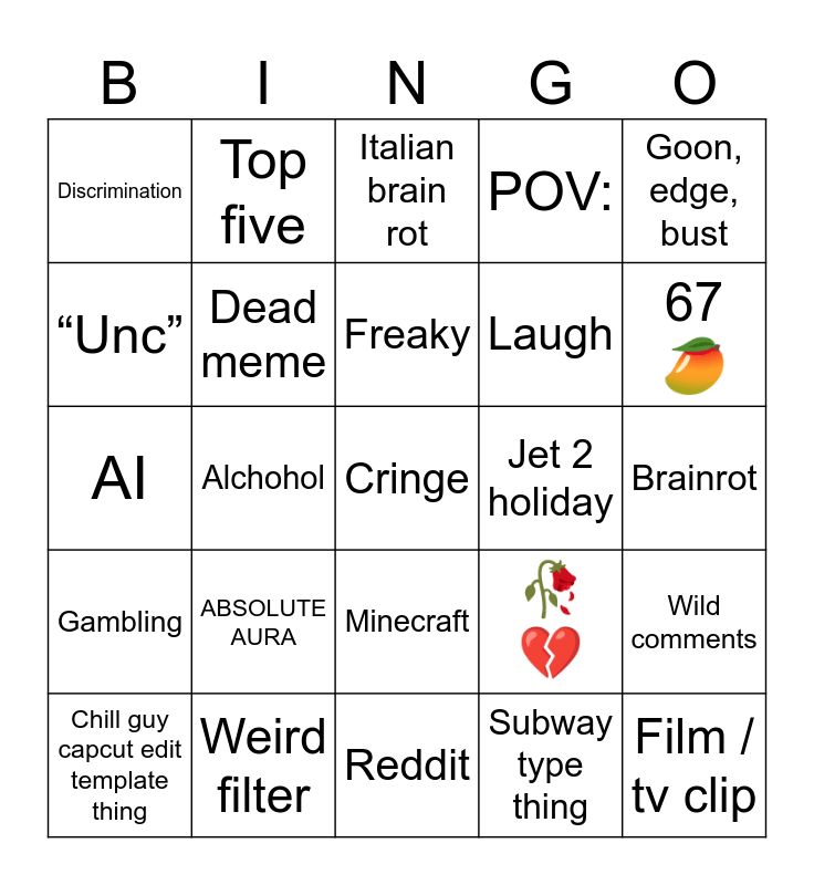 This bingo card has a free space and 24 words: ABSOLUTE AURA, Weird filter, Freaky, Chill guy capcut edit template thing, Goon, edge, bust, Discrimination, “Unc”, Top five, Jet 2 holiday, Minecraft, Laugh, AI, 🥀💔, Wild comments, Dead meme, Subway type thing, Brainrot, Italian brain rot, 67🥭, Alchohol, Film / tv clip, Gambling, POV: and Reddit.