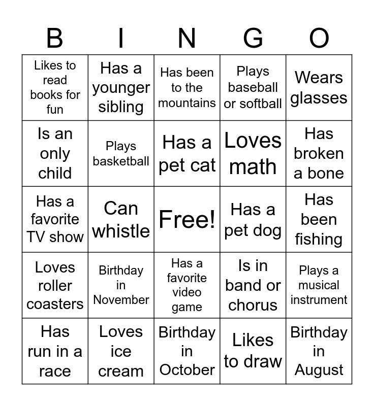 This bingo card has a free space and 50 words: Birthday in July, Birthday in August, Birthday in September, Birthday in October, Birthday in November, Birthday in December, Has a younger sibling, Has an older sibling, Is an only child, Plays soccer, Plays basketball, Plays baseball or softball, Plays a musical instrument, Is in band or chorus, Has been on an airplane, Has been out of the country, Has a pet cat, Has a pet dog, Has a pet other than a cat or dog, Wears glasses, Can whistle, Likes to draw, Likes to read books for fun, Loves math, Loves science, Can ride a bike without training wheels, Has broken a bone, Has been to the beach, Has been to the mountains, Has a favorite video game, Speaks more than one language, Has been in a school play, Has met someone famous, Loves pizza, Loves ice cream, Can swim, Can do a cartwheel, Has been camping, Has ridden a horse, Has been fishing, Likes to bake or cook, Can snap their fingers, Is left-handed, Has a favorite sports team, Has run in a race, Has a favorite TV show, Can sing well, Has traveled to another state, Loves roller coasters and Likes spicy food.