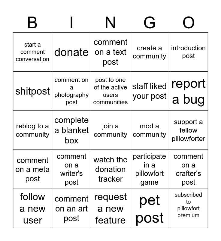 This bingo card has a free space and 24 words: follow a new user, comment on a writer's post, post to one of the active users communities, pet post, introduction post, start a comment conversation, donate, comment on a text post, mod a community, support a fellow pillowforter, reblog to a community, comment on a photography post, participate in a pillowfort game, comment on a crafter's post, shitpost, comment on an art post, request a new feature, create a community, report a bug, comment on a meta post, complete a blanket box, watch the donation tracker, staff liked your post and subscribed to pillowfort premium.