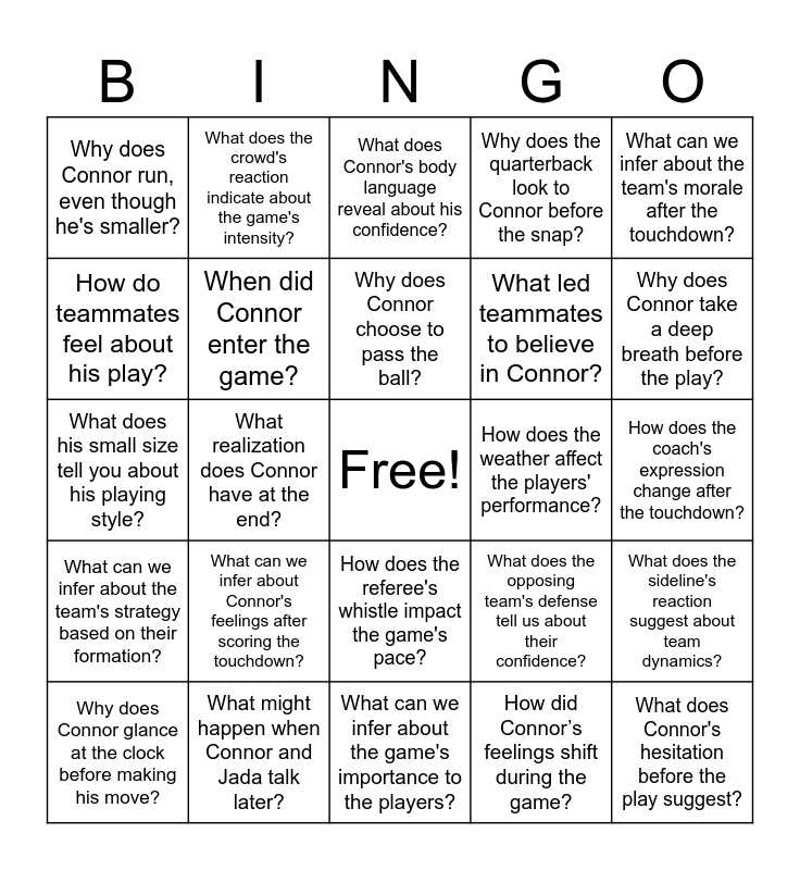 This bingo card has a free space and 24 words: What can we infer about Connor's feelings after scoring the touchdown?, What might happen when Connor and Jada talk later?, Why does Connor choose to pass the ball?, Why does Connor glance at the clock before making his move?, What can we infer about the team's morale after the touchdown?, Why does Connor run, even though he's smaller?, How do teammates feel about his play?, What does the crowd's reaction indicate about the game's intensity?, How does the weather affect the players' performance?, How does the referee's whistle impact the game's pace?, What led teammates to believe in Connor?, What does his small size tell you about his playing style?, What does the opposing team's defense tell us about their confidence?, What does the sideline's reaction suggest about team dynamics?, When did Connor enter the game?, How did Connor’s feelings shift during the game?, How does the coach's expression change after the touchdown?, What does Connor's body language reveal about his confidence?, Why does Connor take a deep breath before the play?, What realization does Connor have at the end?, What does Connor's hesitation before the play suggest?, What can we infer about the team's strategy based on their formation?, Why does the quarterback look to Connor before the snap? and What can we infer about the game's importance to the players?.