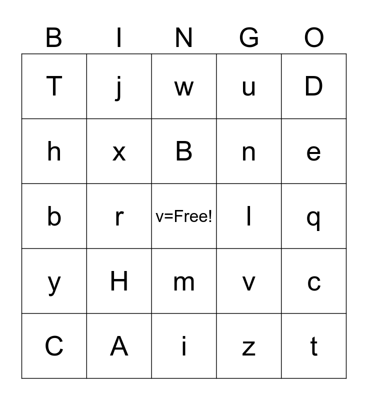 This bingo card has a free space and 24 words: H, A, B, C, D, T, h, j, l, m, n, b, v, c, x, z, q, w, e, r, t, y, u and i.