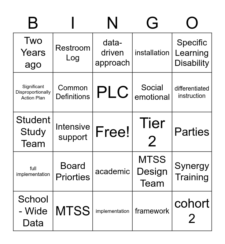 This bingo card has a free space and 24 words: Board Priorties, MTSS, PLC, School - Wide Data, Specific Learning Disability, Two Years ago, Significant Disproportionally Action Plan, Restroom Log, Tier 2, academic, Social emotional, Student Study Team, MTSS Design Team, Synergy Training, Common Definitions, framework, Parties, data-driven approach, differentiated instruction, Intensive support, cohort 2, full implementation, installation and implementation.