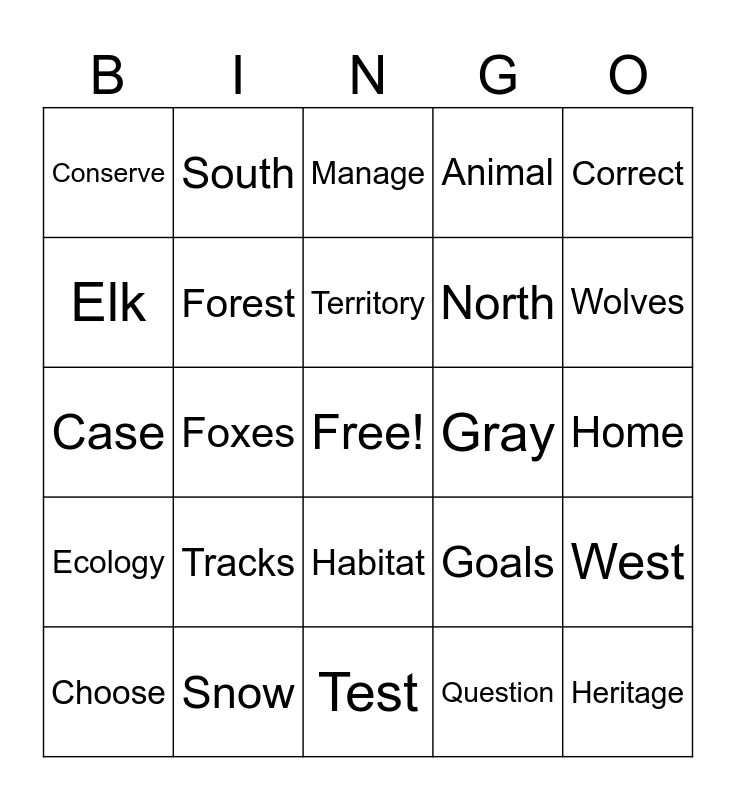 This bingo card has a free space and 24 words: Choose, Tracks, Territory, Question, Correct, Conserve, South, Manage, Gray, Home, Case, Forest, Goals, West, Elk, Snow, Test, Animal, Wolves, Ecology, Foxes, Habitat, North and Heritage.