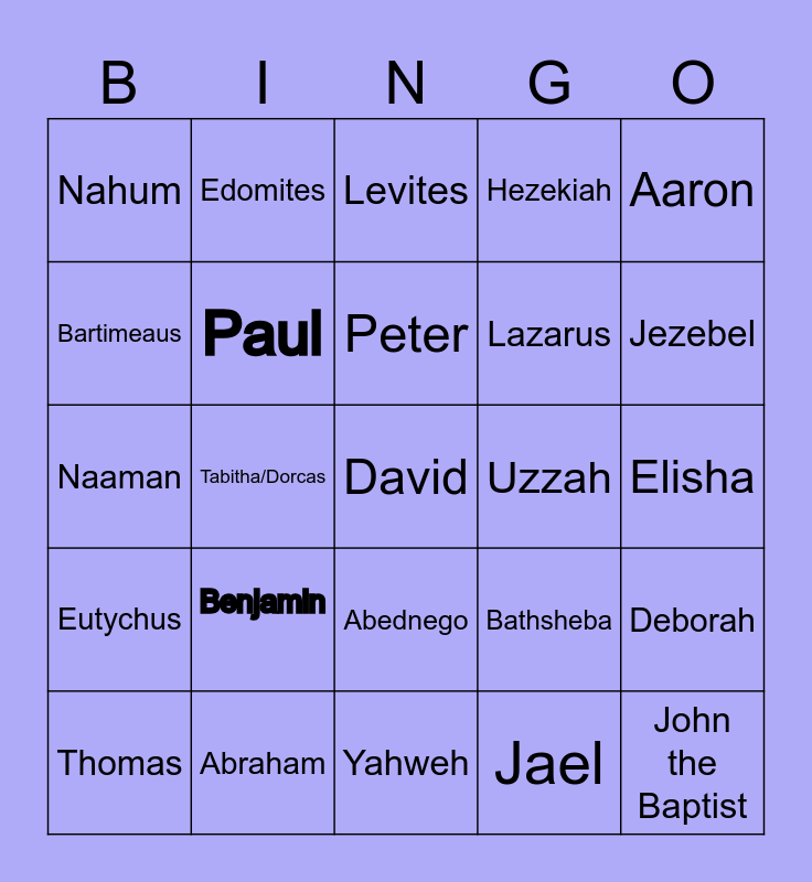 This bingo card has a free space and 24 words: Benjamin, Abraham, Peter, Thomas, Aaron, Nahum, Bartimeaus, Edomites, Uzzah, Abednego, Lazarus, Naaman, Bathsheba, Deborah, Paul, Jael, Elisha, Levites, Jezebel, Tabitha/Dorcas, John the Baptist, Eutychus, Hezekiah and Yahweh.