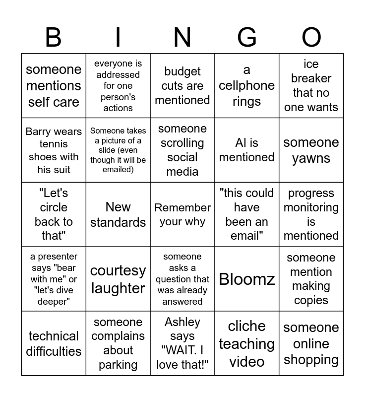This bingo card has a free space and 39 words: "let's break into small groups", not enough handouts for everyone, Seesaw is mentioned, Someone takes a picture of a slide (even though it will be emailed), technical difficulties, someone asks a question that was already answered, someone scrolling social media, someone mentions personalized learning, ice breaker that no one wants, a presenter says "bear with me" or "let's dive deeper", New standards, a cellphone rings, someone online shopping, progress monitoring is mentioned, "this could have been an email", courtesy laughter, session goes longer than scheduled, someone mentions self care, restorative practices in mentioned, Bloomz, Barry wears tennis shoes with his suit, Ashley says "WAIT. I love that!", AI is mentioned, someone yawns, someone mentions student dress code, insert teaching acronym here, "best practices", DATA, "meet students where they are", everyone is addressed for one person's actions, the meeting starts late, someone makes an unneeded suggestion, budget cuts are mentioned, someone complains about parking, cliche teaching video, someone asks a question that only pertains to them, someone mention making copies, "Let's circle back to that" and someone asks a completely unrelated question.