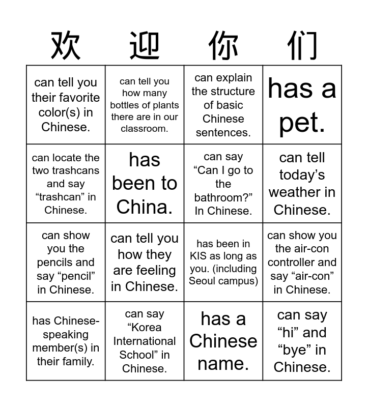 This bingo card has 16 words: can say “Korea International School” in Chinese., can show you the air-con controller and say “air-con” in Chinese., can explain the structure of basic Chinese sentences., can tell you their favorite color(s) in Chinese., can show you the pencils and say “pencil” in Chinese., can tell you how many bottles of plants there are in our classroom., has been in KIS as long as you. (including Seoul campus), has a Chinese name., can locate the two trashcans and say “trashcan” in Chinese., has been to China., has Chinese-speaking member(s) in their family., has a pet., can tell you how they are feeling in Chinese., can tell today’s weather in Chinese., can say “Can I go to the bathroom?” In Chinese. and can say “hi” and “bye” in Chinese..