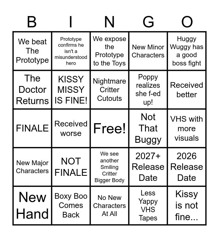 This bingo card has a free space and 24 words: NOT FINALE, Boxy Boo Comes Back, Nightmare Critter Cutouts, New Hand, Huggy Wuggy has a good boss fight, We beat The Prototype, The Doctor Returns, Prototype confirms he isn't a misunderstood hero, Not That Buggy, We see another Smiling Critter Bigger Body, Poppy realizes she f-ed up!, FINALE, 2027+ Release Date, 2026 Release Date, KISSY MISSY IS FINE!, Less Yappy VHS Tapes, VHS with more visuals, We expose the Prototype to the Toys, Received better, Received worse, Kissy is not fine..., New Major Characters, New Minor Characters and No New Characters At All.