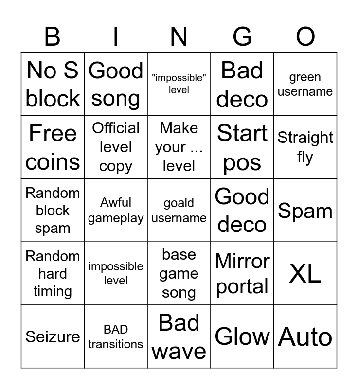 This bingo card has a free space and 27 words: Mirror portal, empty, Start pos, Bad wave, Free coins, "impossible" level, Good song, Random hard timing, Good deco, XL, Random block spam, Bad deco, Seizure, BAD transitions, Straight fly, Tomfoolery, Official level copy, Make your ... level, impossible level, No S block, Spam, Glow, Awful gameplay, Auto, base game song, green username and Secret way.